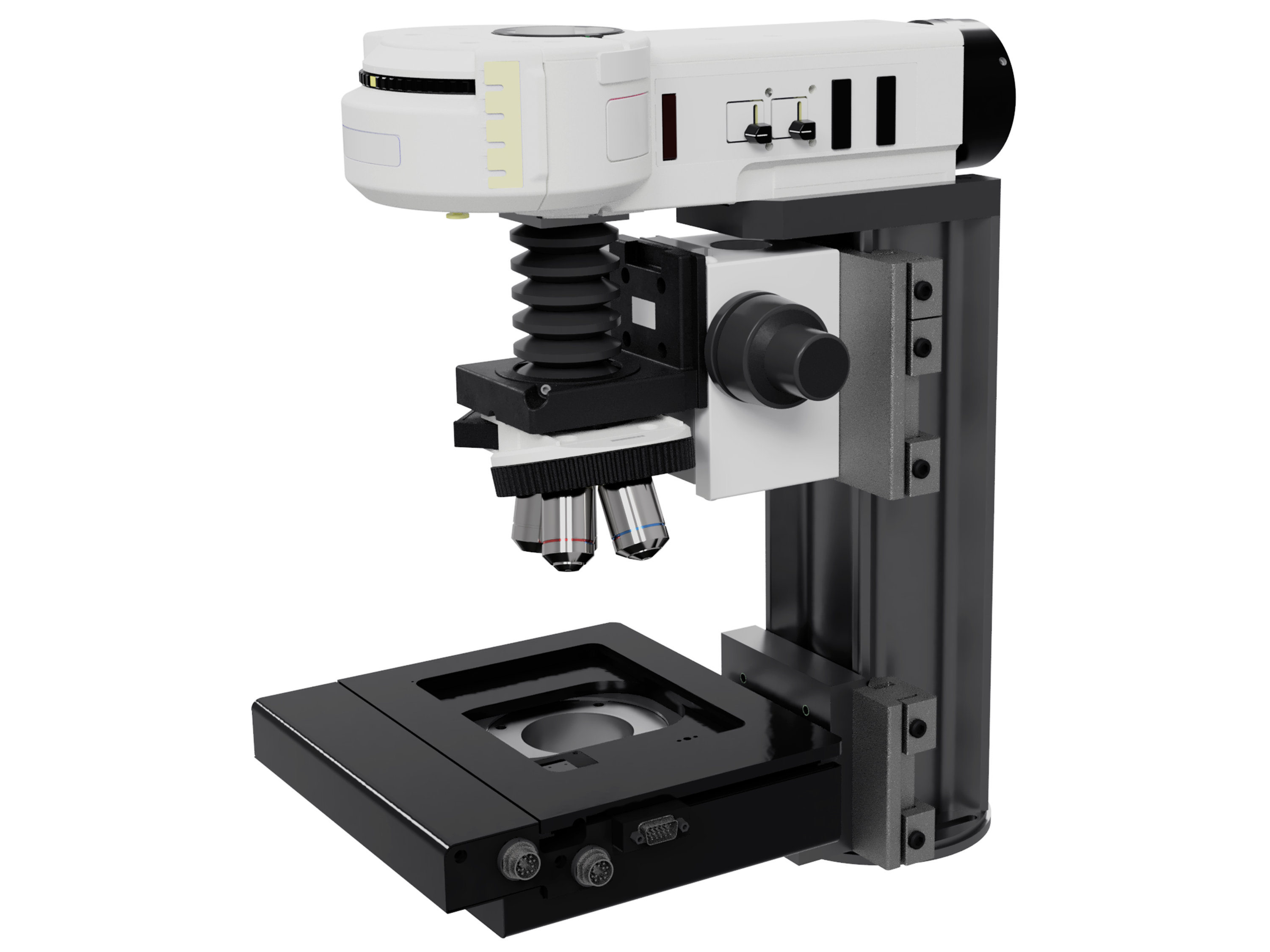 The custom built features a highly adaptable aluminium profile frame, equipped with upright condensers and objective z-drives by Olympus and Märzhäuser.Like the full body Olympus microscopes, we can provide automation for white light, imaging camera, oculars and objective revolvers.